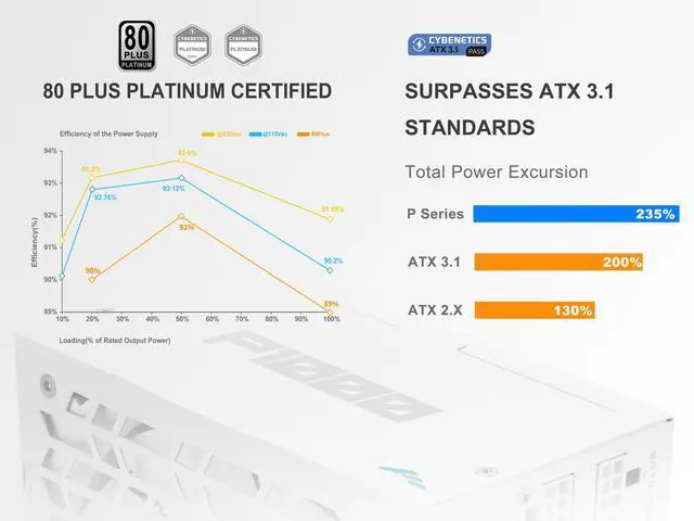 The SAMA P Series delivers 80 PLUS Platinum certified efficiency (over 92%) in a fully modular design, perfect for high-performance PCs. It exceeds ATX 3.1 standards, handling power spikes up to 235% of rated load for ultimate stability.