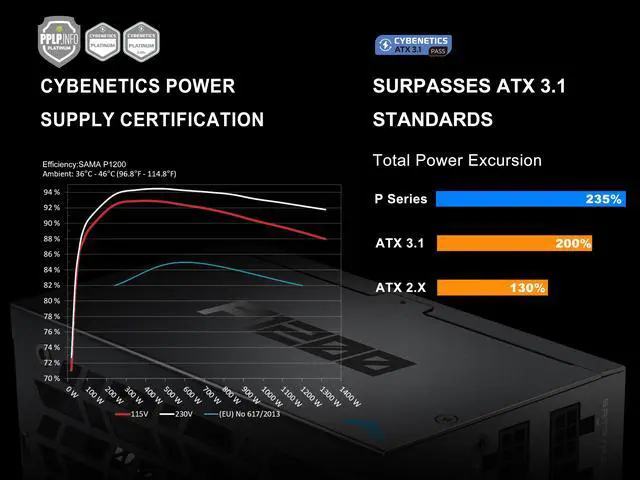 • Cybenetics Platinum Coverage: Fully 1200W power supply, Cybenetics Platinum standards, with 92% or higher efficiency under typical loads.