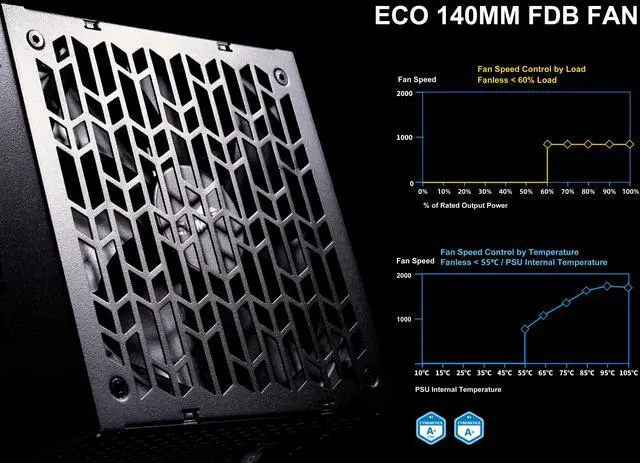 2. 140mm FDB fan with fanless mode below 60% load/55°C