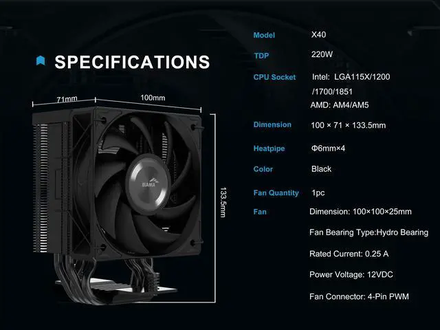 | Fan Dimensions | 100 x 100 x 25mm |