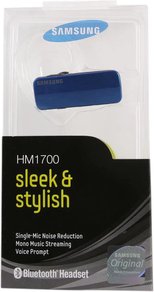 Samsung HM1700 Bluetooth Headset with Noise Reduction and Echo Cancellation, Supports Music Streaming (Blue)The Samsung HM1700 headset is a feature-packed Bluetooth hands-free device that offers high style and functionality at a low price. Featuring Simple Pairing technology, the headset automatically pairs with the closest Bluetooth-enabled device. Simply turn on the Bluetooth feature on your smartphone, then select the HM1700 and you're connected; no passcode needed. And with built-in Multipoint Technology, you can pair the headset to two different devices at once for seamless integration across devices. This feature is indispensible for users who carry both a business phone and a personal phone, or online gamers who like to play on multiple platforms. Superior Sound in Any EnvironmentThe HM1700 delivers top-notch sound via its built-in noise reduction and echo cancellation technology, ensuring crystal clear call clarity, even in noisy environments. You can even stream mono music and podcasts directly to the device from your Bluetooth-compatible media player or computer. Bluetooth 3.0The HM1700 features Bluetooth Version 3.0 and is compatible with all Bluetooth-enabled devices, including the Samsung Galaxy S3. Exceptional Battery LifeThe inline rechargeable battery boasts 9 hours of talk time and up to 350 hours of standby time per charge cycle, and with an automatic volume adjustment to keep ambient sounds out allowing more focus on important calls. Customized FitThe headset ships with three interchangeable soft-gel tips for a customized fit and the ultra-lightweight design ensures that the device remains secure and comfortable, even when worn for long durations. Voice Prompts Keep You InformedThe HM1700 is built with convenience in mind. The built-in voice prompts can tell you when you need to recharge your headset, when you've successfully connected to a device, usage instructions and more. Text-to-Speech For a Truly Hands-free ExperienceFor user with Android-compatible smartphones the HM1700's's built in text-to-speech feature (when used in conjunction with the FreeSync Android#&153; application) can even read your e-mails, SMS messages and identify callers for a truly hands-free experience.