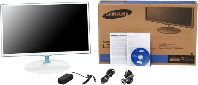 Samsung 24-Inch LED Monitor S24D360HL, VGA cable, and quick setup guide.