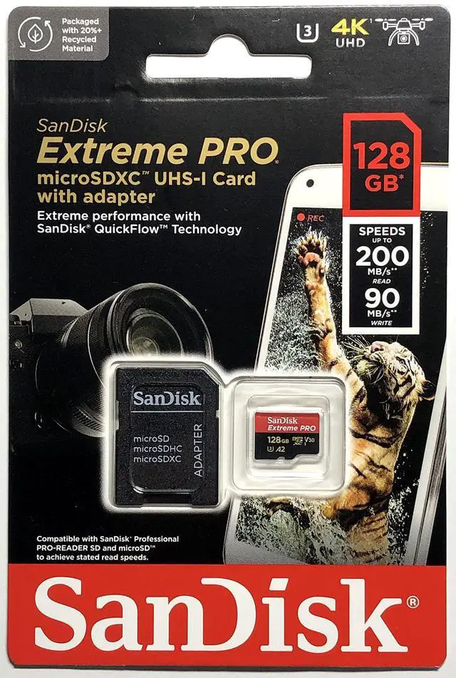 Get extreme speeds from a microSDXC memory card for fast transfer, app performance, and 4K UHD. Ideal for your Android smartphone, action cameras or drones, this high-performance Extreme Pro microSD SDXC card does 4K UHD video recording, Full HD video, and high-resolution photos. Super-fast SanDisk Extreme PRO microSDXC memory card achieves read speeds up to 200MB/s and writes up to 90MB/s. Plus, its A2-rated, so you can get fast application performance for an exceptional smartphone experience.