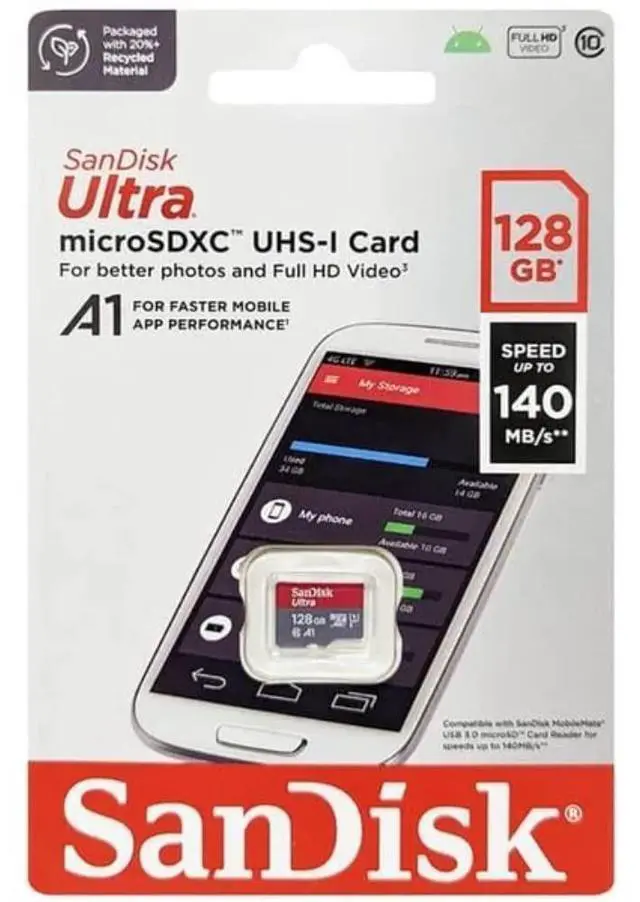 TRANSFER SPEEDS OF UP TO 140MB/S** Blazing transfer speeds mean that your content moves fast letting you move photos fast per minute. LOAD APPS FASTER WITH A1-RATED PERFORMANCE1 Rated A1, the SanDisk Ultra® microSD card is optimized for apps, delivering faster app launch and performance that provides a better smartphone experience. FULL HD VIDEO CAPTURE2 Class 10 speed rating allows you to shoot Full HD video and high quality photos. IDEAL FOR ANDROID SMARTPHONES AND TABLETS SanDisk® cards are compatible with Android smartphones and tablets. SANDISK® MEMORY ZONE APP FOR EASY FILE MANAGEMENT Available from the Google Play store, the SanDisk Memory Zone app lets you view, access, and back up your phone's files in one location.