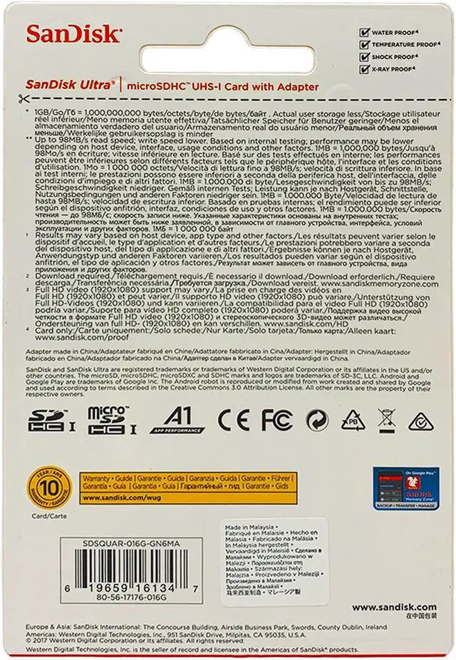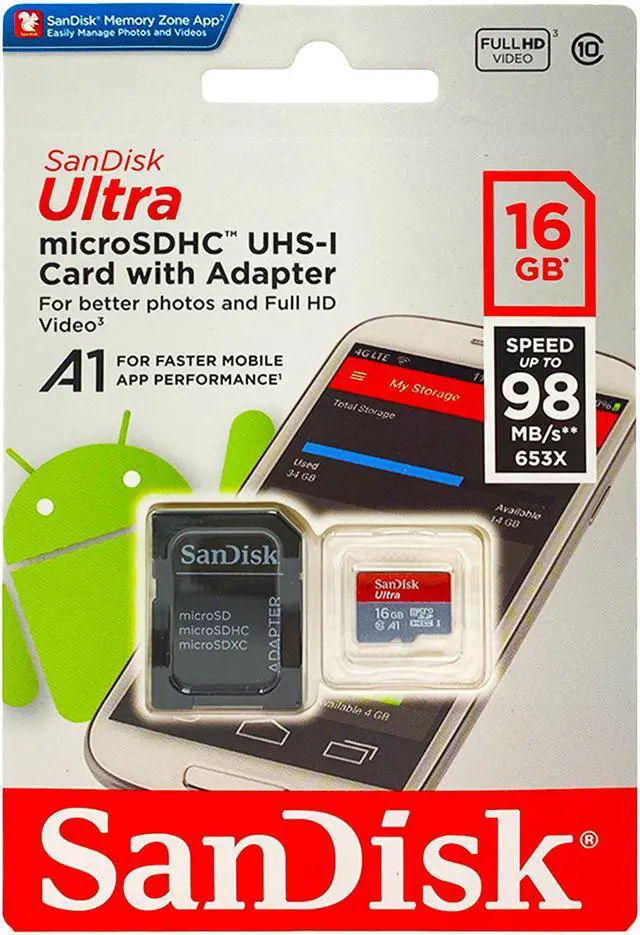 TRANSFER SPEEDS OF UP TO 100MB/S** Blazing transfer speeds mean that your content moves fast letting you move up to 1200 photos in a minute. 6 LOAD APPS FASTER WITH A1-RATED PERFORMANCE1 Rated A1, the SanDisk Ultra® microSD™ card is optimized for apps, delivering faster app launch and performance that provides a better smartphone experience. FULL HD VIDEO CAPTURE2 Class 10 speed rating allows you to shoot Full HD video and high quality photos. IDEAL FOR ANDROID™ SMARTPHONES AND TABLETS SanDisk® cards are compatible with Android smartphones and tablets. SANDISK® MEMORY ZONE APP FOR EASY FILE MANAGEMENT Available from the Google Play™ store, the SanDisk Memory Zone app lets you view, access, and back up your phone's files in one location.