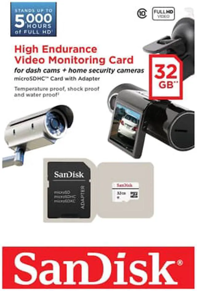 SanDisk SDSDQQ-032G-G46A. Brand NewIncludes 2 Year Warranty.. Product # SDSDQQ-032G-G46A.. High Endurance Meets High PerformanceBuilt to stand up to hours of Full HD video recording, the SanDisk High Endurance Video Monitoring microSDHC and microSDXC Cards provide the capacity, performance and exceptional reliability today's home security and dashcams demand. They're also protected against extreme temperatures, shock, water and x-rays, so you can be confident the evidence is there when you need it. SanDisk High Endurance Video Monitoring Cards are available in capacities of 32GB and 64GB. Ideal for dashcams and home video monitoring cameras.