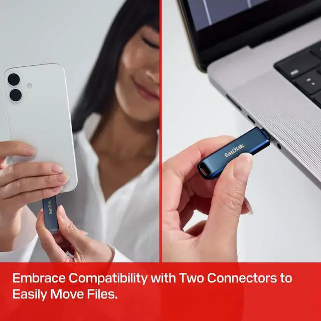 Embrace more compatibility. The SanDisk Phone Drive comes with not one but two connectors so you can easily move files between your iPhone, iPad Pro, Mac, and USB Type-C devices.