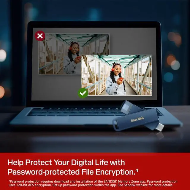 Picture a world where your photos and videos seamlessly interconnect across your iPhone, iPad, and Mac products. This is life with the SanDisk Phone Drive. With reliable transfer rates, you can move photos and videos between your USB Type-C Apple devices in an instant. Encryption4 to help secure your device and simple backup utilizing the SanDisk mobile app makes it so youre always ready for more. Enjoy a robust and beautiful Metallic Sky finish that's more than an accessory; it's essential.