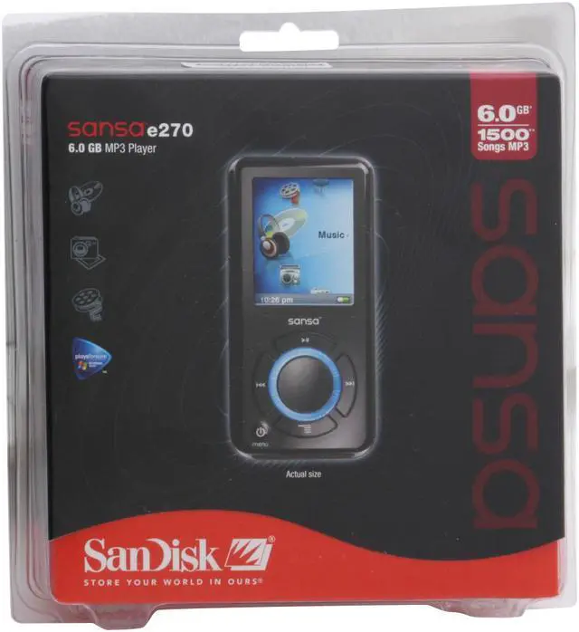 6GB Storage CapacityWith a stunning 6GB storage capacity, store up to 1,500 songs or 100 hours of music or thousands of photo files in the SanDisk Sansa e270!