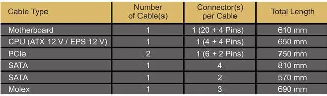 20/24Pin MB: One cable (610mm) 8/4+4Pin CPU: One cable (650mm) PCI-E 6+2Pin: Two cables (750mm) 4 x SATA: One cable (450+120+120+120mm) 2 x SATA: One cable (450+120mm) 3 x Molex: One cable (450+120+120mm)