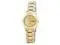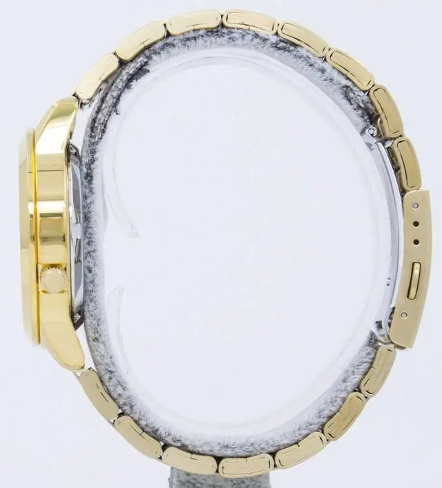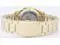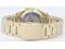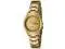 Dial Color: Gold Tone, Crystal: Hardlex, Hands: Gold Plated Luminous, Markers: Gold Tone with Arabic Numerals at 6:00 and 12:00, Calendar: Day/Date in English/Spanish at 3:00, Bracelet: Gold Plated, Clasp