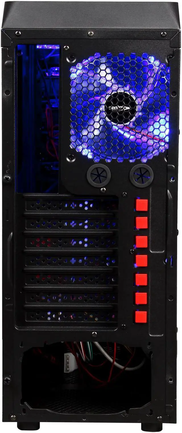 Unmatched Cooling1x 120mm front blue LED fan, 2x 120mm side blue LED fans, 1x 120mm rear blue LED fan and 2x 120mm top blue LED fans ensure efficient ventilation and effective system cooling. Blue light ray revealed through meshed holes creates a mystic ambience.