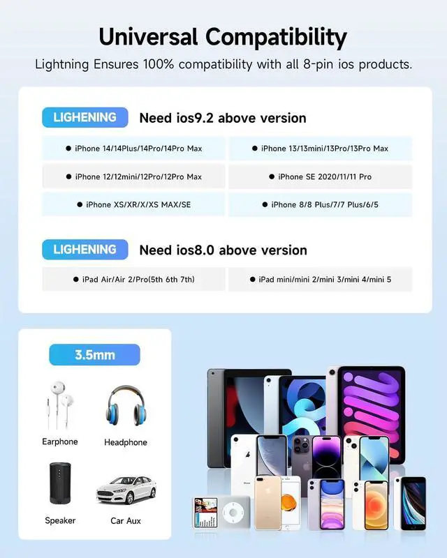 Perfect CompatibilityThis Seulliya headphone adapter is particularly Designed for iPhone Lovers. Suitable for iPhone 14/14 Plus/14 Pro/14 Pro Max/iPhone 13/13 Pro/13 Pro Max/12/12 Pro/12 Pro Max/11/11 Pro/11 Pro Max, iPhone XR/XS/XS Max/X, iPhone 8/8 Plus, iPhone 7/7 Plus 6/6Plus iPod/iPad and all iOS systems. This adapter can be used with any 3.5mm jack accessory. Integrated into the smart chip, you don't have to worry about system updates