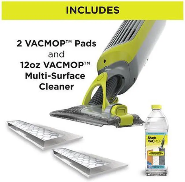 Shark VACMOP unit, 2 Disposable Pads & 1 (12oz.) bottle of Multi-surface cleaner.