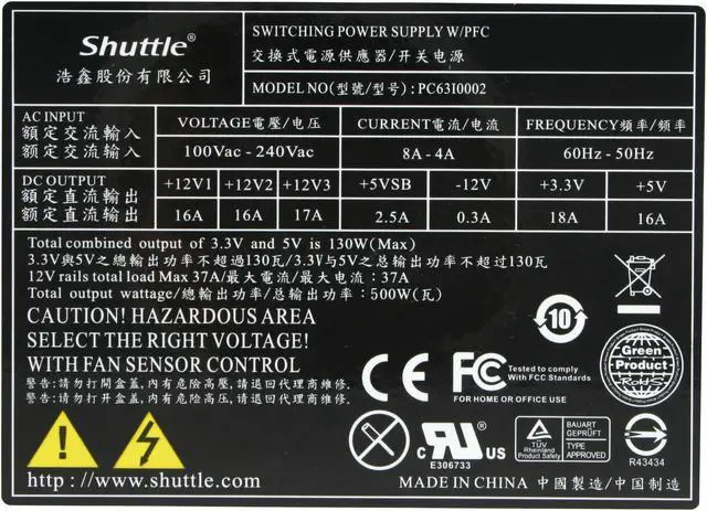 | Specifications | Output wattage: Total combined output is 500W max. Total combined output of 3.3V and 5V is 130W max. Active PFC circuit (Power Factor Correction) Input Voltage/Frequency range: 100~240V AC, 50/60Hz (90~264V AC, 47~63 Hz) Input current: max. 8A/4A for 115V/230V AC during normal operating Inrush current: 60A/90A for 115V/230V AC DC voltage output, max. output current: +12V1: 16A +12V2: 16A +12V3: 17A +5VSB: 2.5A (Standby) -12V: 0.3A +3.3V: 18A +5V: 16A Power Connectors: 1x ATX power 20 pins 1x ATX 12V power 4+4 pins *) 1x PCIe power 6 pins 1x PCIe power 6+2 pins 3x Serial ATA power 2x Molex power 1x Floppy power Output voltage timing: Hold up time: >17ms at full load at 115V AC Rise time: <20ms at full load, nominal line Protection: Short circuit protection (SCP) - Latch off Overpower (overload) protection (OPP) Overcurrent protection (OCP) Overtemperature protection (OTP) Overvoltage protection (OVP) Undervoltage protection (UVP) Efficiency: 80PLUS Bronze compliant The PSU provides at least 82/85/82% efficiency at 20/50/100% load. Certification: EMI/RFI: FCC class B, CE, BSMI, CCC Safety: cUL, TÜV, CB, BSMI, CCC Timing, housekeeping and control conform Intel ATX12V Specific Guidelines 2.3 Mean Time Between Failures (MTBF) > 100.000 hours at 75% load, 25°C Temperature: Operating temperature: +10°C ~ +50°C Storage temperature: -40°C ~ +70°C Noise: <30dB at 50cm for 200W load Ball bearing fan with thermal Fan-speed control Dimensions: 200 x 82 x 53 mm (LWH) Weight: net weight: 1.1 kg, gross weight: 1.2 kg Compatibility: Supported Shuttle XPC models: H series e.g. SN78SH7, SG45H7, SP45H7 and SX58H7 Cable lengths designed for the Shuttle XPC. |