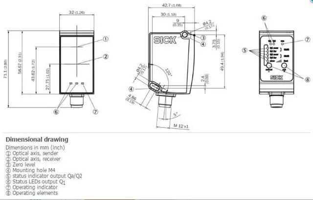 input: laser off / external teach / deactivated, reset to factory default Average laser service life (at 25 °C) 100, 000 h MECHANICS/ELECTRONICS Supply voltage Vs DC 12 V... 30 V 1) 2) Ripple = 5 Vpp 3) Power consumption = 1.7 W 4) 5) Initialization time = 500 ms Warm-up time = 20 min Housing material Plastic (ABS and PC) Acrylic glass (PMMA) Connection type Male connector, M12, 5-pin Indication LEDs Weight 65 g Enclosure rating IP65 IP67 Protection class III