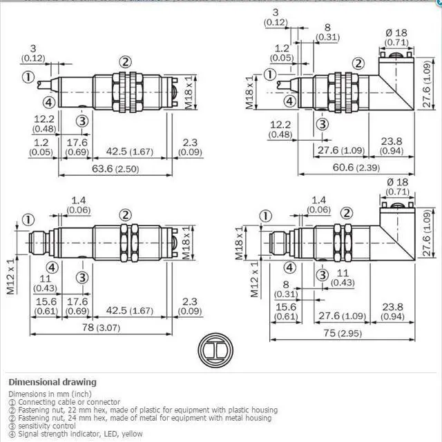 100 mA Response time = 2 ms 5) Switching frequency 250 Hz 6) Connection type Cable, 4-wire, 2 m 7) Cable material PVC Conductor cross-section 0.14 mm² Cable diameter Ø 5 mm Circuit protection A 8) B 9) C 10) D 11) Protection class III Weight 100 g Polarisation filter? Housing material Plastic, PBT/PC Optics material Plastic, PMMA Enclosure rating IP67 Ambient operating temperature –25 °C... +70 °C UL File No. NMFT2. E175606
