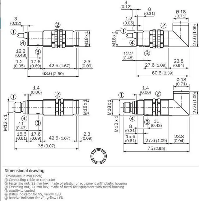 100 mA Response time = 2 ms 5) Switching frequency 250 Hz 6) Connection type Male connector M12, 4-pin Circuit protection A 7) B 8) C 9) D 10) Protection class III Weight 240 g Housing material Metal, Nickel-plated brass Enclosure rating IP67 Test input sender off TE to 0 V Ambient operating temperature –25 °C... +70 °C UL File No. NMFT2. E175606
