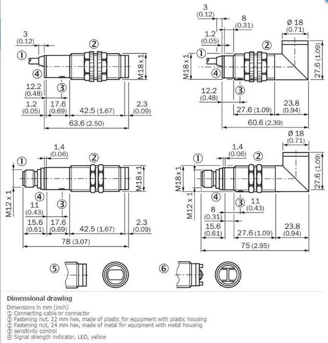 100 mA Response time = 2 ms 4) Switching frequency 250 Hz 5) Connection type Male connector M12, 4-pin Circuit protection A 6) B 7) C 8) D 9) Protection class III Weight 120 g Housing material Metal, Nickel-plated brass Optics material Plastic, PMMA Enclosure rating IP67 Ambient operating temperature –25 °C... +70 °C UL File No. NMFT2. E175606E175606