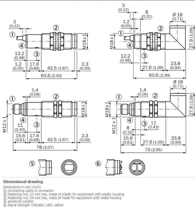 100 mA Response time = 2 ms 5) Switching frequency 250 Hz 6) Connection type Cable, 4-wire, 2 m 7) Cable material PVC Conductor cross-section 0.14 mm² Cable diameter Ø 5 mm Circuit protection A 8) B 9) C 10) D 11) Protection class III Weight 120 g Housing material Metal, Nickel-plated brass Optics material Plastic, PMMA Enclosure rating IP67 Ambient operating temperature –25 °C... +70 °C UL File No. NMFT2. E175606