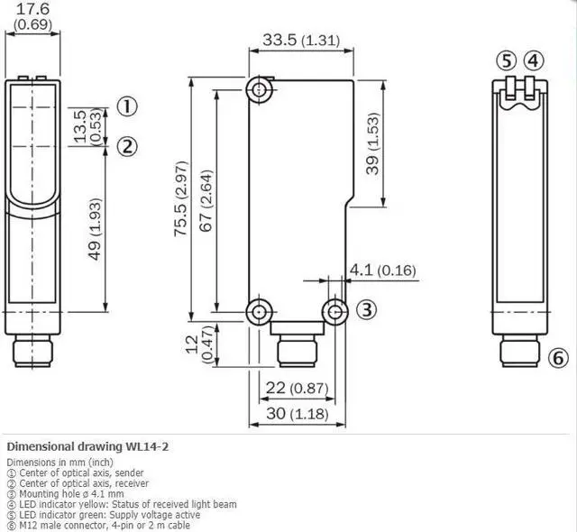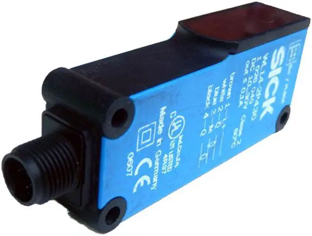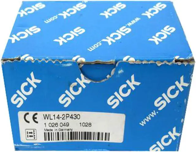 SICK WL14-2P430 Photoelectric Retro-Reflective Rensor, PNP, New FEATURES Sensor/ detection principle Photoelectric retro-reflective sensor, Dual lens Dimensions (W x H x D) 17.6 mm x 75.5 mm x 33.5 mm Housing design (light emission) Rectangular Sensing range max. 0.15 m... 6 m 1) Sensing range 0.15 m... 4 m 1) Type of light Visible red light Light source LED 2) Light spot size (distance) Ø 140 mm (4 m) Angle of dispersion Approx. 2° Wave length 645 nm Adjustment None MECHANICS/ELECTRONICS Supply voltage 10 V DC... 30 V DC 1) Ripple 5 Vpp 2) Power consumption 35 mA 3) Switching output PNP Output function Complementary Switching mode Light/dark switching Output current Imax.