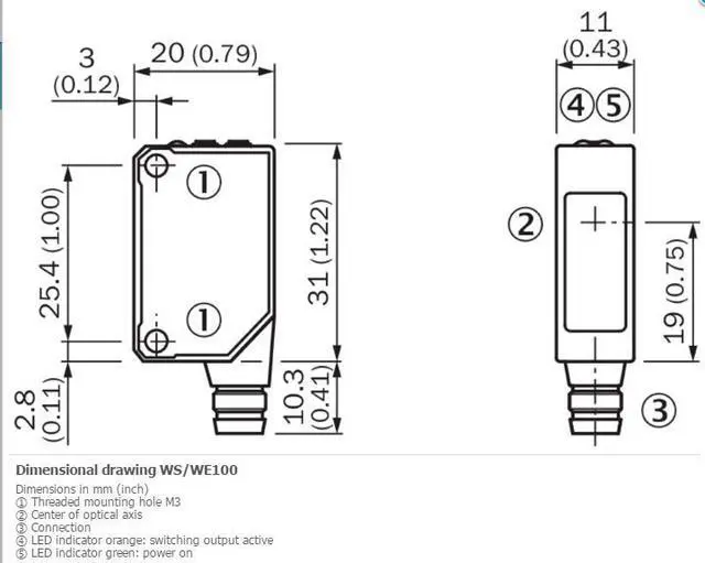 VS / < 1.8 V Output current Imax. 100 Response time = 0.5 ms 4) Switching frequency 1, 000 Hz 5) Angle of reception Approx. 15° Connection type Cable, 3-wire, 2 m 6) Cable material PVC Conductor cross-section 0.18 mm² Circuit protection A 7) B 8) D 9) Weight 106 g Housing material Plastic, ABS/PC/POM Optics material Plastic, PMMA Enclosure rating IP65 Items supplied 2 Stainless steel mounting brackets ( 1.4301 /304) BEF-W100-A Ambient operating temperature –25 °C... +55 °C Ambient storage temperature –40 °C... +70 °C