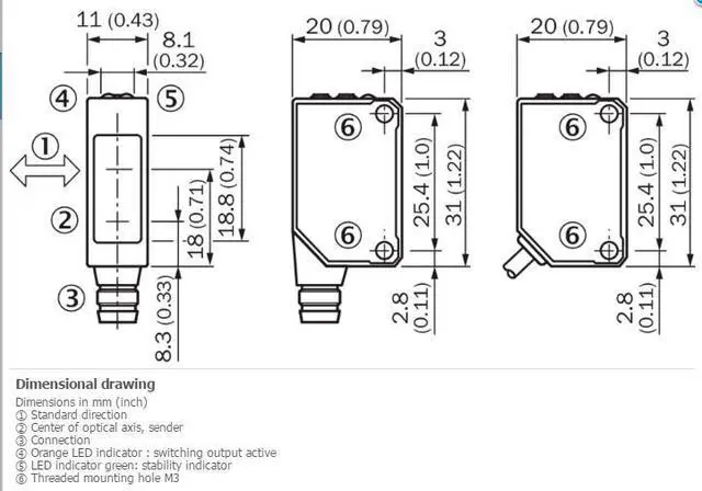 VS – 1.8 V / 0 V Output current Imax. = 100 mA Response time = 0.5 ms 4) Switching frequency 1, 000 Hz 5) Connection type Male connector M8, 4-pin Circuit protection A 6) B 7) D 8) Weight 10 g Housing material Plastic, ABS Optics material Plastic, PMMA Enclosure rating IP67 Items supplied Stainless steel mounting bracket ( 1.4301 /304) BEF-W100-A Ambient operating temperature –25 °C... +55 °C Ambient storage temperature –40 °C... +70 °C