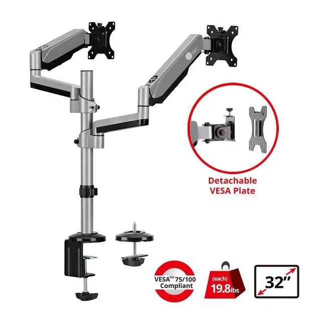 Product Description: SIIG Dual Stacked Monitor Arm Desk Mount - 17" - 32" - Max Load 19.8lbs each - VESA 75/100mm mounting kit - for 2 LCD displays - 9 kg each, VESA 75/100 mm - silver,