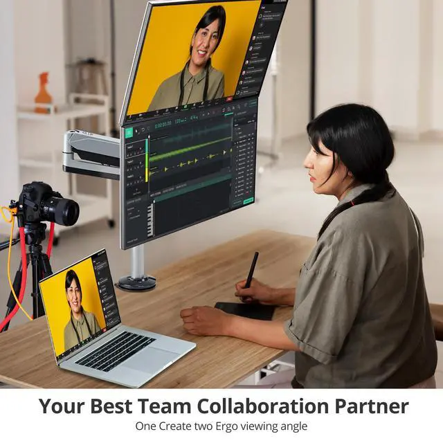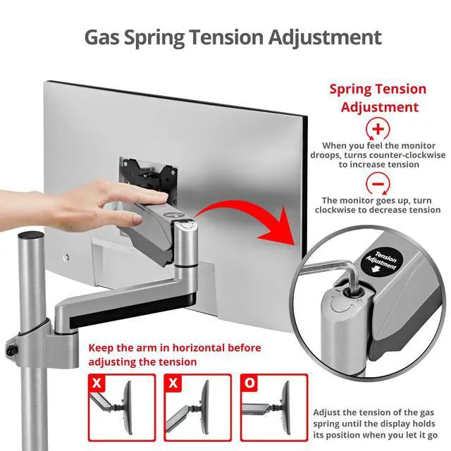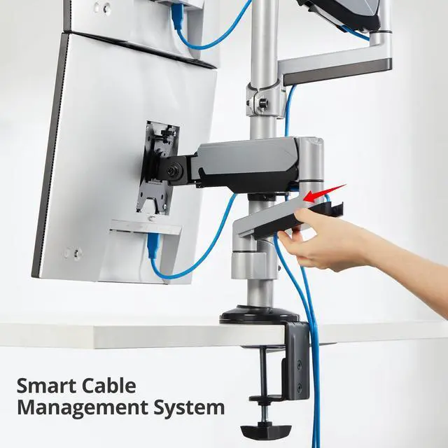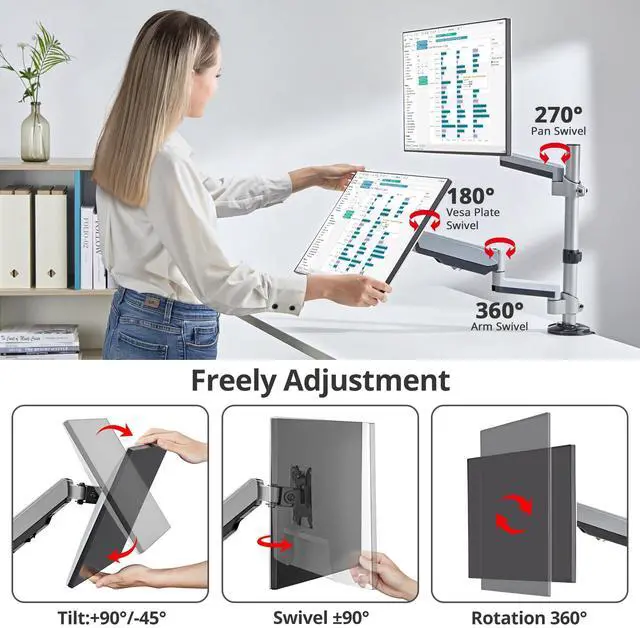 Fine-tune your monitor setup to perfection with full-motion arm, featuring 35° upward and downward tilt, 180° swivel, and 360° screen rotation. The monitors with 18.8" center pole, which supports raising your monitors up to 28" and extending your screen up to 16.6" each. C-clamp and Grommet bases are both included in the package for a quick and easy installation, C-clamp fits most desktops from 0.4" to 3.4" thick with a needed 3.1" depth, Grommet mount supports up to 3.3" thick with a Grommet hole diameter between 0.4" to 2.3",