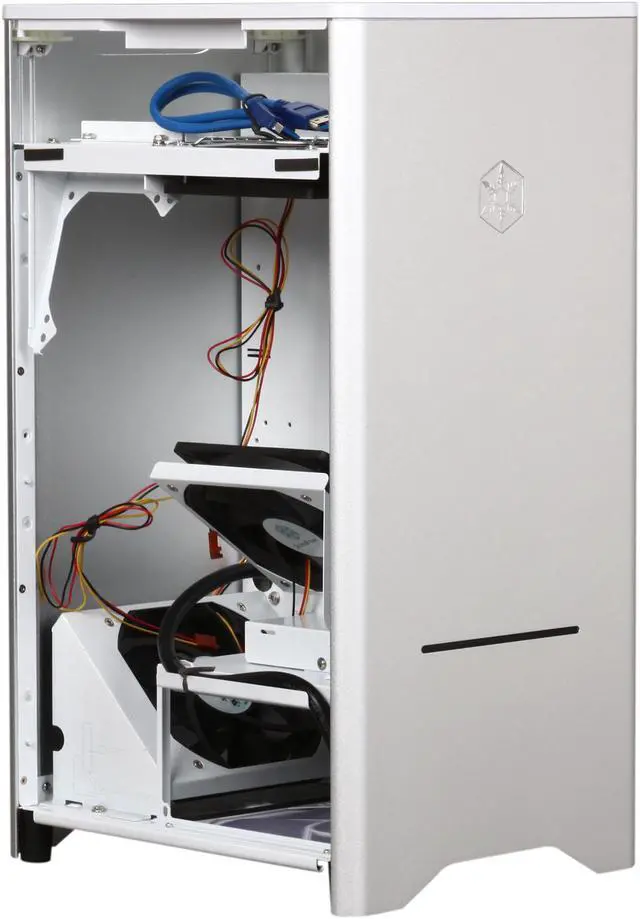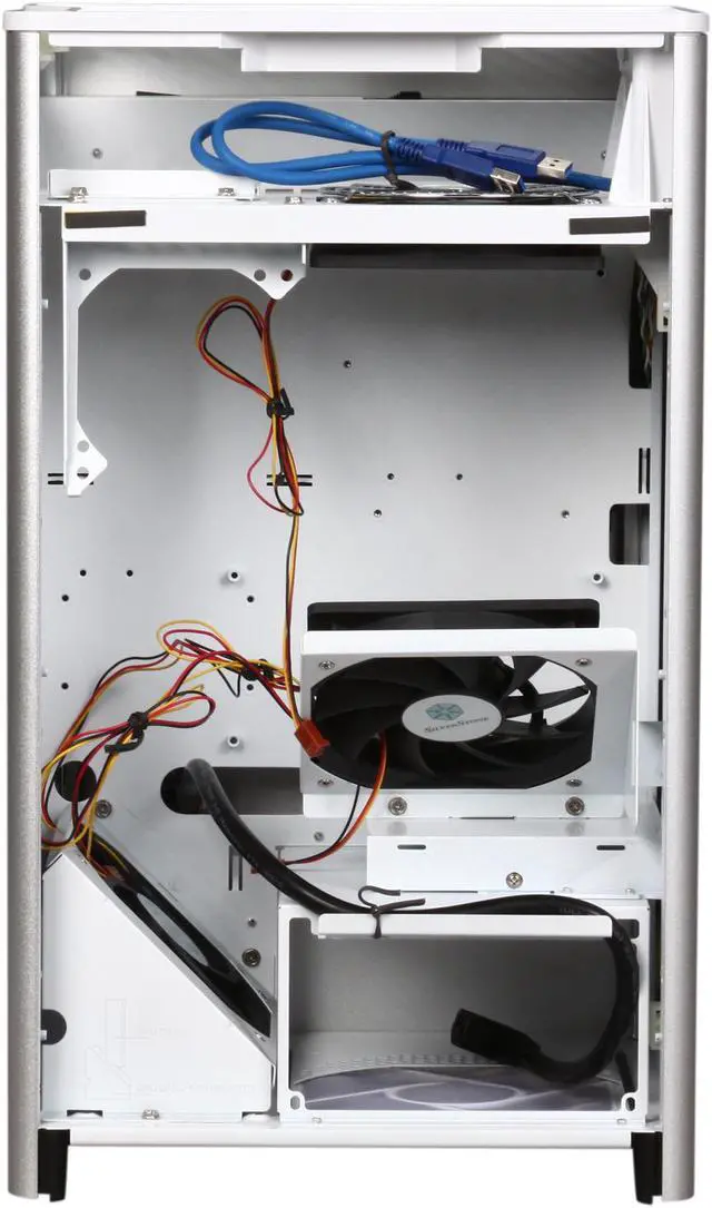 The interior of the chassis utilizes SilverStone's unique stack effect cooling layout so a Micro-ATX motherboard is mounted in 90-degree rotation to take advantage of hot air's natural tendency to rise. This design also enables the FT03 to support graphics cards that are as long as 13.7 inches without the chassis taking up similar room depth-wise. In addition, the chassis also supports three 3.5" hard drives with one capable of hot-swapping function and one 2.5" drive bay for excellent storage flexibility.