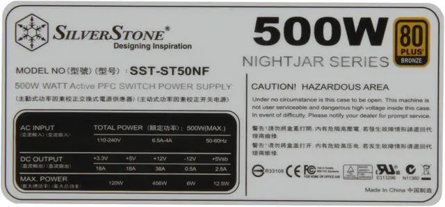 • newegg500W Continuous Power with Single Strong +12v RailThe SILVERSTONE ST50NF is capable of delivering 500W continuous power output, with +12V @ 38A single rail design to ensure the maximum provision of 12V power to energy-hungry graphics cards perfect for future high-end component upgrades or overclocking.