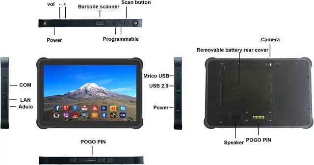 Interface: in/out port 1. normal USB*1 2. Micro USB*1 3. RJ45*1 4. bottom pogo pin *1, USB and serial 5. back pogo pin *1 6. DC*1 3.5 * 1.35 7. microphone+earphone 8. RS232*1