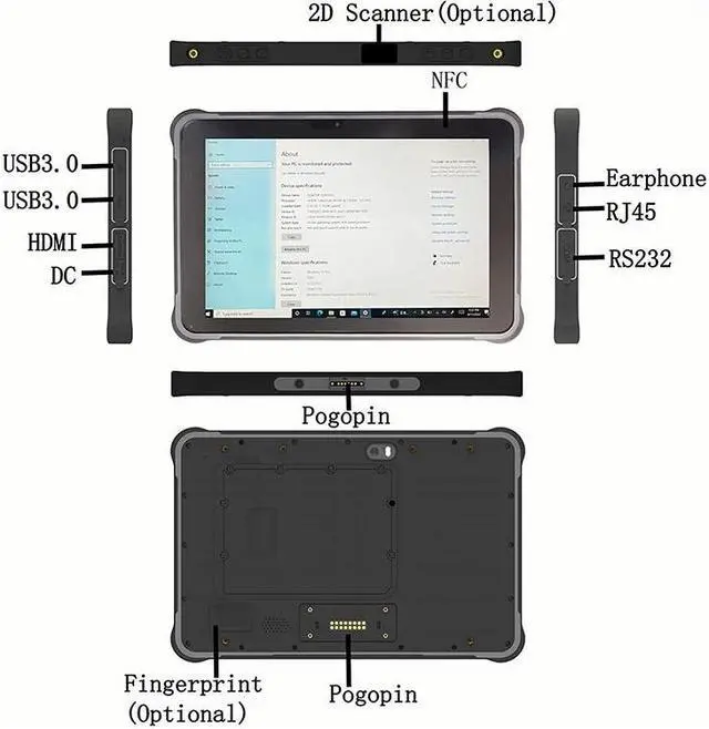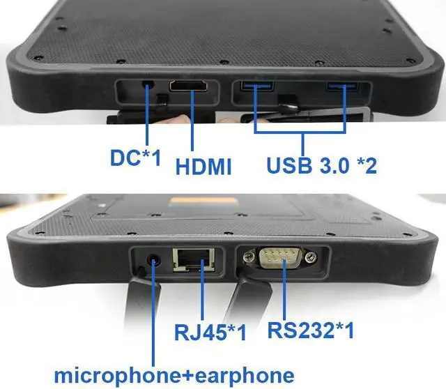 2. Micro USB*1 3. RJ45*1 4. bottom pogo pin*1, USB and serial 5. back pogo pin*1 6. DC*1 3.5 * 1.35 7. microphone & earphone 8. HDMI 9.