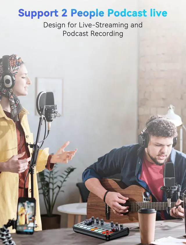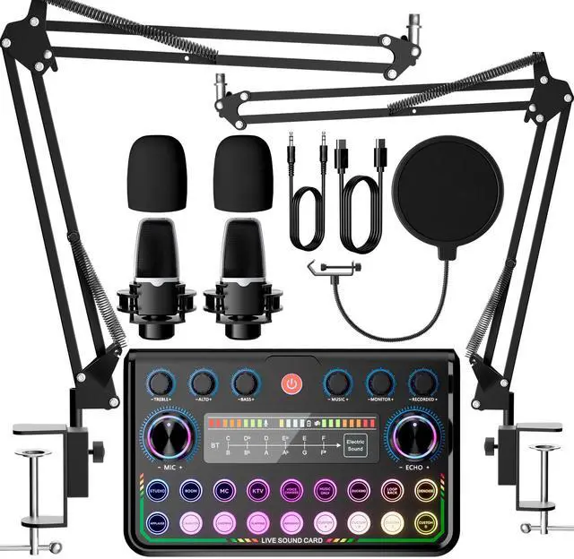 Podcast Equipment Bundle For 2, SINWE RGB Audio Interface with 3.5mm Microphone, Bluetooth, 4 Customize Soundpads for Live Streaming, Podcasting, Content Create, Gaming