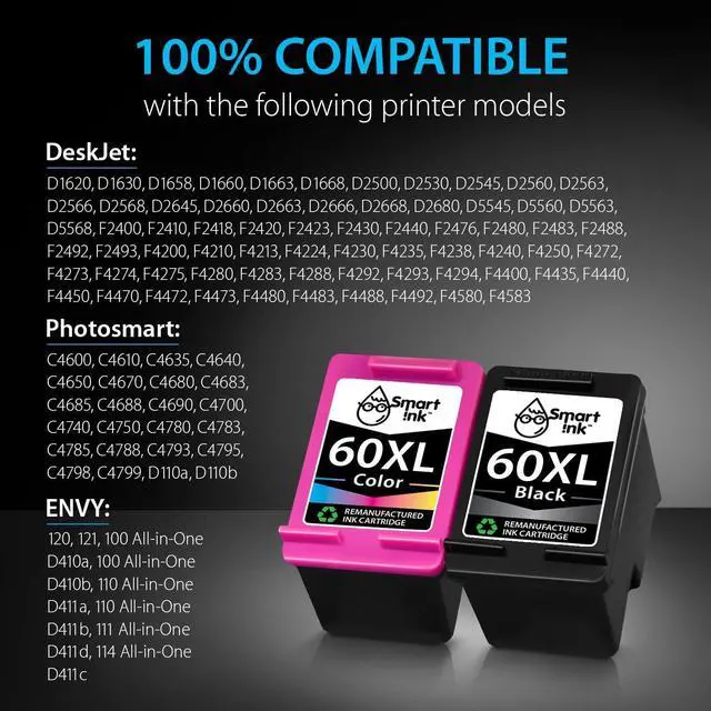 Excellent Print Quality: Smart Ink 60XL ink cartridges are remanufactured from OEM products, professionally cleaned, refilled, and tested to provide you with the same print quality as the original ink cartridges