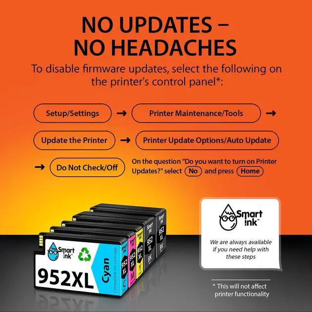 No updates - No headaches: Printer auto-updates may interrupt your printing with compatible cartridges when most needed; we recommend turning off the auto-updates to avoid unpleasant surprises (the instruction in image 3)