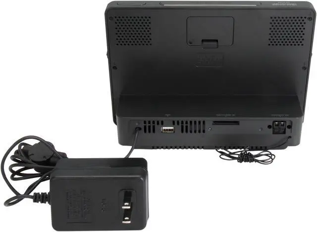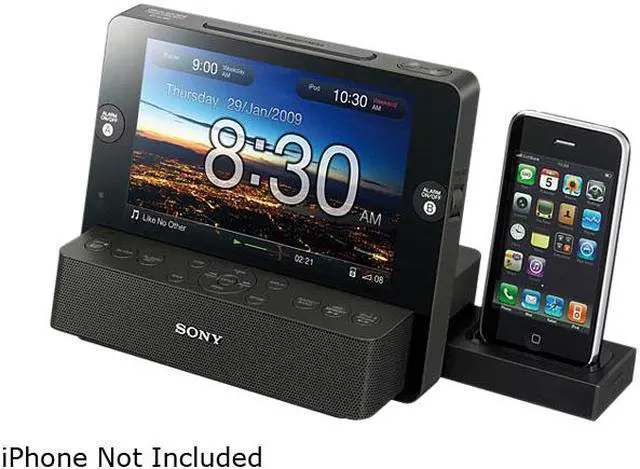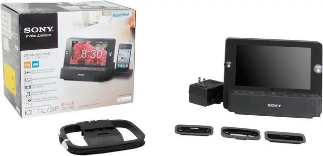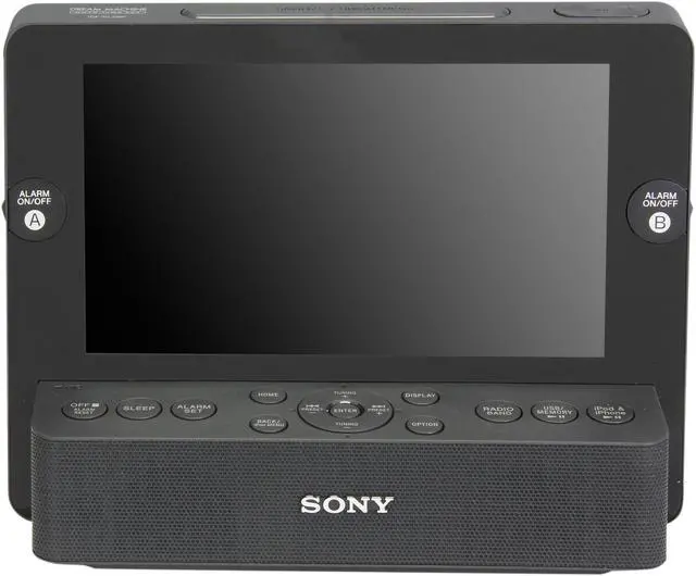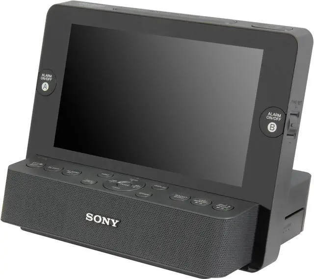 | Specifications | Audio - Format(s) Supported : MP3 (Layer 1/2/2.5/3) and WMA Version 7.0, Version 8.0 - Frequency Range : FM: 87.5 - 108 MHz, AM: 530 -1710 kHz - Full Range Speaker Size : 1.2" (31.3 mm) x 2 - Sound Enhancer : Nature View and Sound: Sea Waves, Birds, Rain, Brook, Under the Sea - Speaker Output : 1 W x 1 W - Station Preset(s) : 20 FM, 10 AM - Tuner Type : AM/FM Inputs and Outputs - Antenna Terminal(s): AM antenna terminals FM wire antenna (fixed) - Audio In: Retractable charging dock for iPod®1 and iPhone™ and 1GB2 built-in memory - PC Audio Input(s): Memory Video Format(s) Supported : MP4, Motion JPEG and AVI Display Screen Size : 7" Diagonal Panel Type : LCD WVGA (800 x 480) Voice Recorder : Record up to 10 seconds Day/Night Function : 4 Step brightness control (Hi, Mid, Lo, Night Mode) Output Power: 1 W x 1 W (at 10% harmonic distortion) Power Requirements: 120 V AC, 60 Hz (For clock backup: one CR2032 battery) Power Type: DC 5V Dimensions (Approx.) : 8 1/8 x 5 7/8 x 4 3/4" not including projecting parts and controls Weight (Approx.) : 2 lbs. including power supply unit Convenience - AM/FM Memory Presets : 20 FM/10 AM - Alarm : Dual - Autoclock Technology : Automatic Time Set and Automatic Daylight Savings Time Adjustment - Snooze w/Extendable Snooze : Snooze: 10 minute intervals up to 1 hour - Timer Clock : Sleep timer: 10 min./20 min./30 min./60 min./90 min./120 min. |