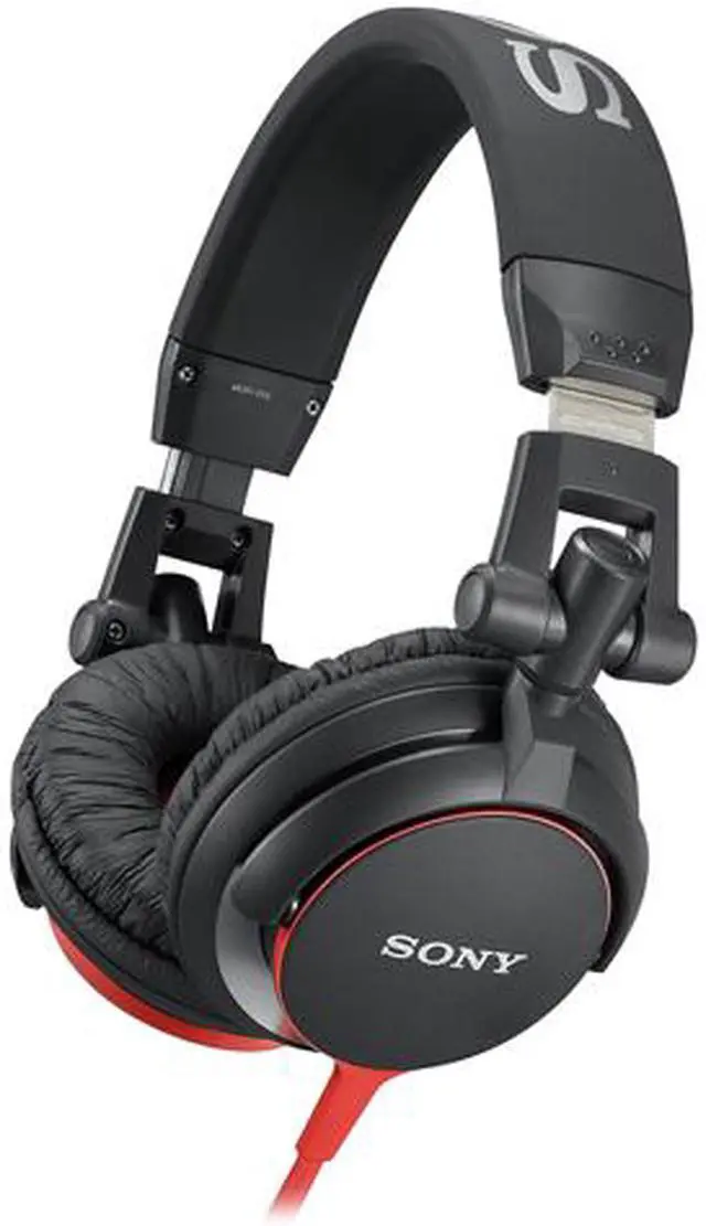 The Sony MDR-V55 DJ Style Headphones (Black/Red) are circumaural, closed-back stereo headphones featuring neutral playback with swiveling earcups that fold flat to conserve space when not in use. One of the earcups is reversible for DJ use and both of them, as well as the headband are padded and adjustable for comfortable extended wear and a secure fit.