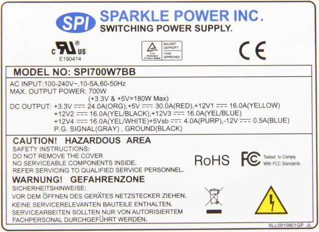 | Features | 80PLUS, RoHS Compliant Active Power Factor Correction (PFC) meet EN61000-3-2 Compatible with European Union Directive 2002/95/EC (Restriction on Hazardous Substances). Remote ON/OFF function 100% Hi-pot, ATE, and burn-in tested Re-settable power shut down Complies with FCC part 15 subpart J class B 115Vac operation, and CISPR 22 class B at 230Vac operation |