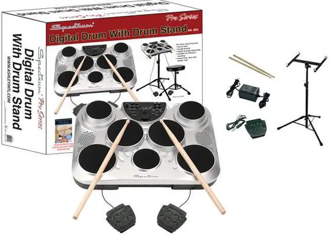 | Feature | Spectrum 7-Pad Digital Drum Set with Drum Stand: 7 pads, 2 foot pedals Includes 215 voices, 20 preset kits, 10 user kits and 100 preset songs Controls: power switch, kit, pad assign, song, hand percussion, drum off, select -/+, volume, pan, gain, save start/stop, demo, record, click, tempo -/+, play/stop LED display Includes AC adapter, drum sticks and heavy-duty adjustable drum stand |