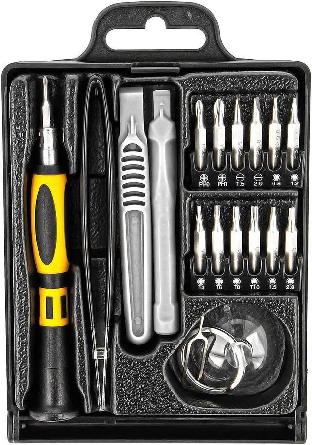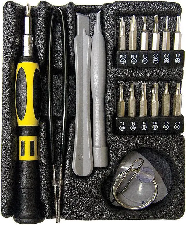 | Features | Easy grip screwdriver handle with 13 pcs for 4mm bits - slot, Philips, Torx, hex and penalobe 2PCs plastic prying tools Guitar pick opening tool Suction vacuum opener Sim card Ejector pin tool and tweezers |