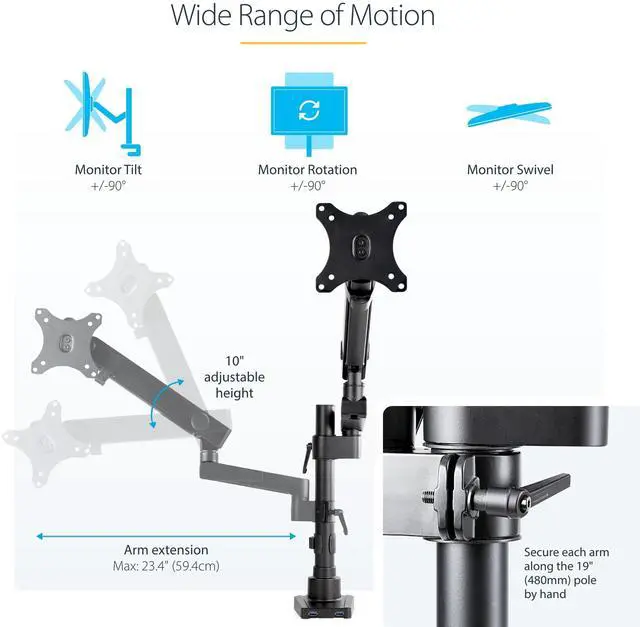 With its articulating arm, the monitor mount makes it easy to find the right viewing angle. Pan +90/-90 degrees left or right and tilt your display +90/-90 degrees up or down. For landscape or portrait viewing, rotate your display +90/-90 degrees.