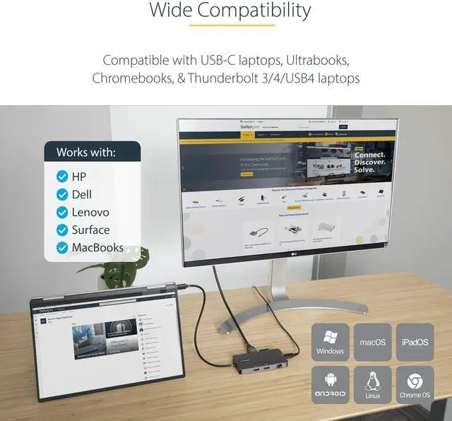 COMPATIBILITY: USB-C travel docking station is compatible with Windows-based USB-C & Thunderbolt 3/4/USB4 laptops such as HP, Dell, Lenovo, Surface Laptop 3 and up/Pro 7 and up, Chromebooks, plus support for Windows, Chrome OS