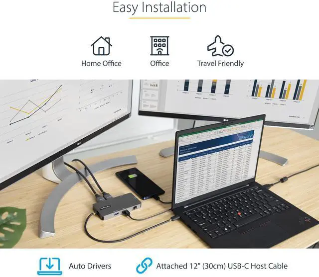 EASY INSTALLATION: Extended connectivity with attached 12in (30cm) USB Type-C host cable; Automatic driver setup; Ideal for office or work-from-home workstations, and presenting from a boardroom, or conferencing with remote workers using Zoom/MS Teams