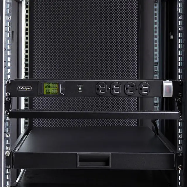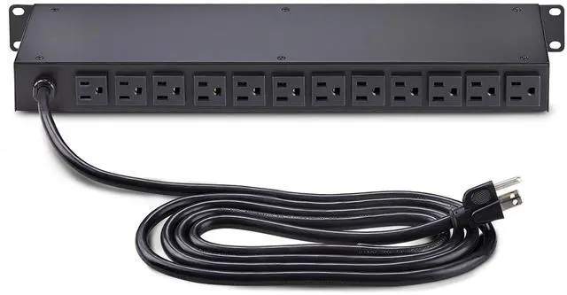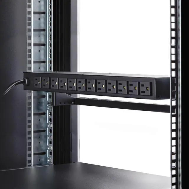 RACK MOUNTABLE: 1U horizontal rackmount PDU for EIA-310-compliant 19-inch server racks/cabinets that are 4in (10.1cm) or deeper; Made of cold-rolled steel w/textured finish for sturdiness & long-lasting durability; 12x rear and 4x front electrical outlets