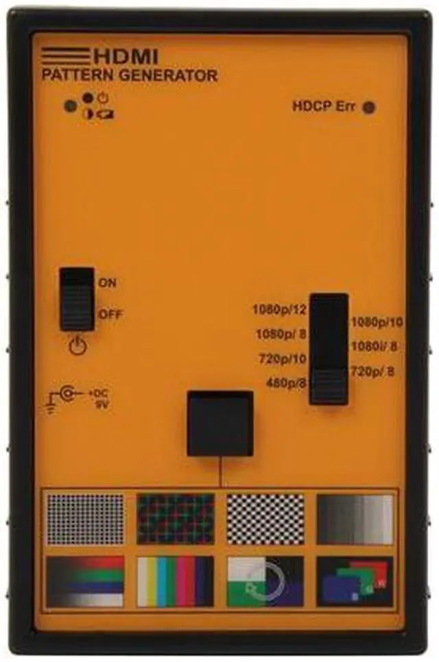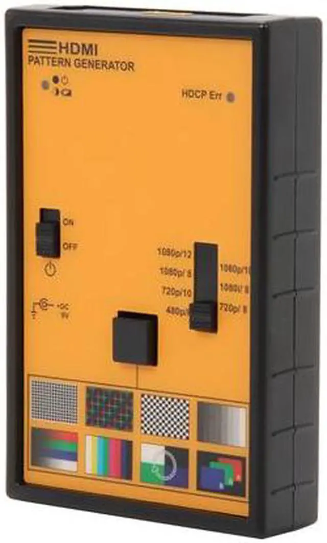 | Features | 8 built-in video test patterns Supports resolutions up to 1080p @ 60Hz High Speed HDMI, HDCP 1.2 compliant Test color, linear, and HDCP functionality Easy to use resolution selector switch and pattern selection button Powered using the supplied AC adapter or a 9V battery Applications - Can be used with both HDMI and DVI displays using an HDMI to DVI cable - Save time and money by quickly determining what may need to be corrected with an HDTV - Use to test and maintain studio equipment such as HDTV displays, cabling, and recording equipment - Great for Digital Signage installers, TV engineers or technicians looking to test and calibrate a DTV display - As an educational tool, teachers can use this device to train their students about the latest DTV quality test technologies - Use in a retail setting to show side-by-side comparisons of quality - Perfect for an installer, integrator, or A/V enthusiast calibrating to get them most out of equipment |