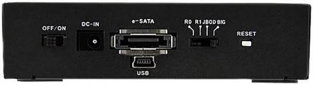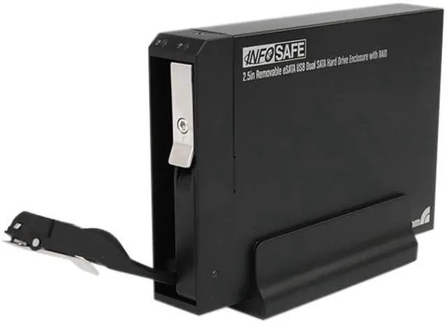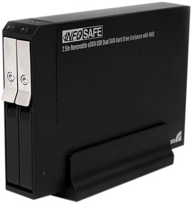 | Features | Accepts up to two 2.5" SATA drives in a single enclosure Supported RAID modes: 0, 1, JBOD (single), BIG (Spanning/Concatenation) Lockable drive doors 15, 000+ insertion rating Durable aluminum construction Power/Activity LED indicators for each drive SATA revision 2 compliant eSATA host interfaces, with support for transfer rates up to 3.0 Gbps High Speed USB 2.0 compliant host interface, with support for transfer rates up to 480 Mbps Compatible with SATA revision 1/2/3 (1.5/3.0/6.0 Gbps) drives Supports 2.5" form factor hard drives (HDD) and solid state drives (SSD) No drivers or software required Compact form factor |