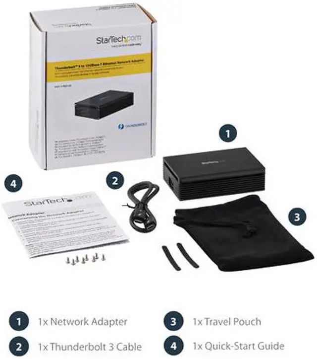 1 x Network Adapter 1 x Thunderbolt 3 Cable 1 x Travel Pouch 1 x Quick-Start Guide