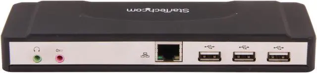The USBDOCK2 offers several commonly used interface ports, such as 10/100Mbps RJ45 Ethernet, 3.5mm mini-jack audio connectors for headphones and microphones, and 4 additional USB 2.0 ports.