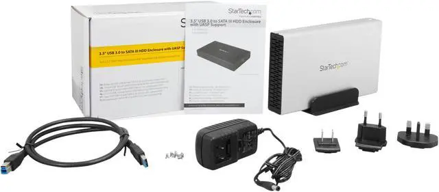 1 - 3.5" USB 3.0 SATA III HDD Enclosure 1 - Screw Kit 1 - Universal Power Adapter (NA / UK / EU) 1 - USB 3.0 Cable (1m) 1 - HDD Stand 1 - Product Manual
